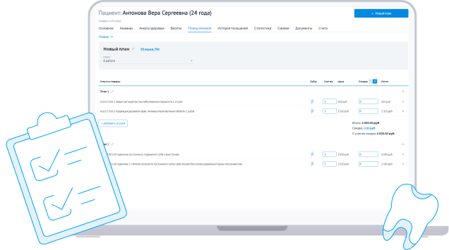 Составлять комплексный план лечения в стоматологии врачам помогает разбивка на этапы. Программа сама посчитает стоимость каждого из них в отдельности и суммарно с учетом скидок. Если план лечения взят в работу, в нем будет отображаться прогресс его выполнения: с каждой добавленной в лечение услугой в визит проставляется отметка о ее готовности.